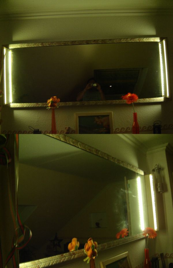Diese Beleuchtung des Spiegels habe ich mal eben zwischendurch gemacht. Anhand der Fotos und der Schnittzeichnung ist der Aufbau zu erkennen.