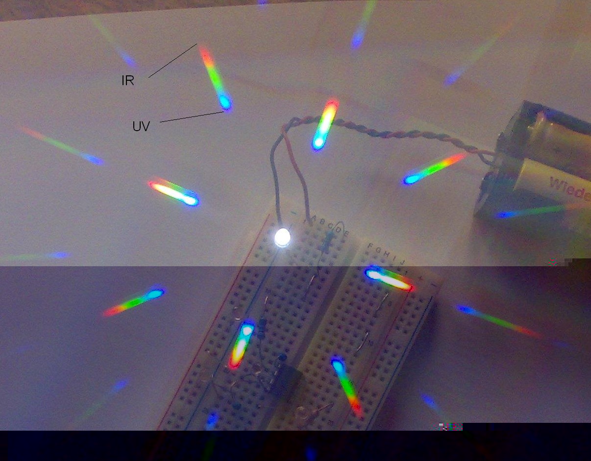 Hab das grating einfach direkt vor die Kameralinse gehalten und abgedrückt. Wenn man sich das Teil vors Auge hält, siehts genauso aus. Man erkennt gut den "Regenbogen" an Farben. Unterhalb läge dann UV und oberhalb IR. Wenn man das ganze nochmal mit sehr wenig Umgebungslicht macht, und fest installiert, kann man evtl. sogar eine Eichung selbst machen, indem man verschiedene bekannte LEDs misst und dann hochrechnet.