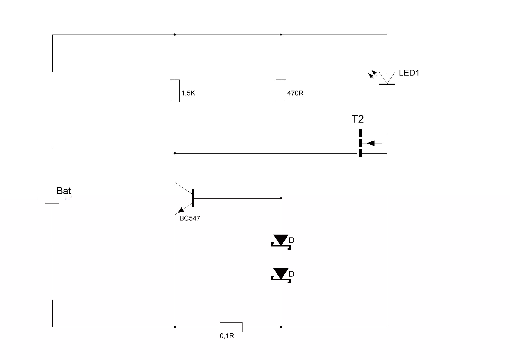 In der Sim (LTSpice) bekomme ich mit dem 'guten' MosFet (IRF7401), R2=470Ohm, R4=0.33Ohm bei einer BAT54 Diode einen Strom von 700mA. Wenn ich die BAT54 Diode durch die 1N5819 ersetze, bekomme ich 1070mA(!). Wenn ich dann R4 auf 0.47Ohm erhöhe, passt es wieder (750 mA), aber die Regelung über R2 passt dann nicht mehr (müsste dann eher zwischen 33Ohm und 250Ohm liegen).
