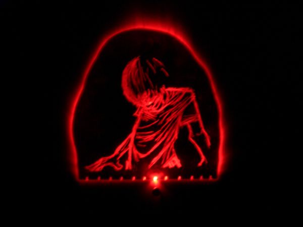 Ich zeig euch erst ma mein Walpaper. Das diente als Vorlage! Und das Ergebnis! Das war nur'n Test! Wie ihr sicher seht steckt da nur eine Led in der Bohrung. Wenn ich's hinbekomme soll da ne rgb Steuerung rein, deswegen sind da auch so viele Bohrungen drin!