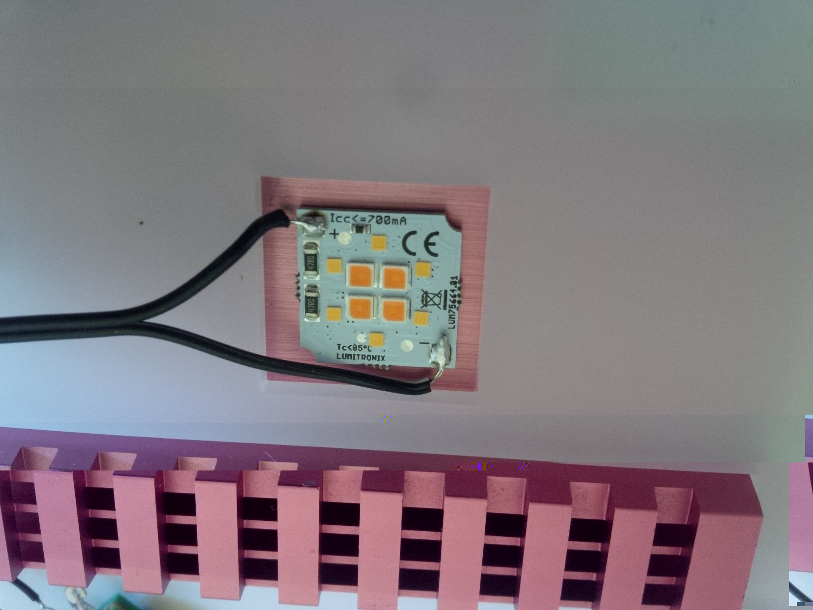 Hier noch Fotos (Belichtung und Weißabgleich fest) von dem SmartArray mit minimaler Befeuerung, der maximalen Helligkeit bevor die kaltweißen LEDs zünden, der ungefähr minimalen Helligkeit der kaltweißen LEDs sowie einer etwas helleren Einstellung: