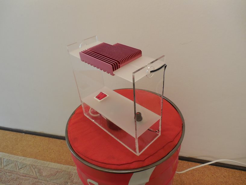 Gebaut werden soll also eine Box aus Acryl, in der die Elektronik sitzt. Diese ist gleichzeitig der Fuß der Leuchte und der Deckel der Box wird als "Bedienpanel" mit Ein-/Ausschalter und Drehregler zum Dimmen dienen. Die Seitenwände der Box sind höher, um oben den Leuchtenkopf zu halten. Im Gegensatz zum Mockup soll die Box natürlich allseitig geschlossen werden, und der Leuchtenkopf schwenkbar werden.