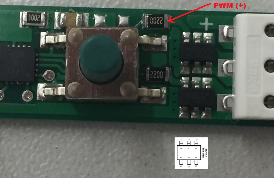 Ich kann zwar den genauen Typ des Mosfets nicht erkennen, aber es passt genau zum üblichen Layout eines N-Channel Mosfets mit TSOP6 Gehäuse. Also kann (mit 99% Sicherheit) am markierten Punkt (am Widerstand kann man leichter löten als am Mosfet) ein Low Level PWM Signal (vmtl. mit +5V) abgegriffen werden. PWM- entspricht dem Minus Pol des Dimmer-Eingangs. Ob es wirklich +5V PWM sind könnte man noch nachmessen: