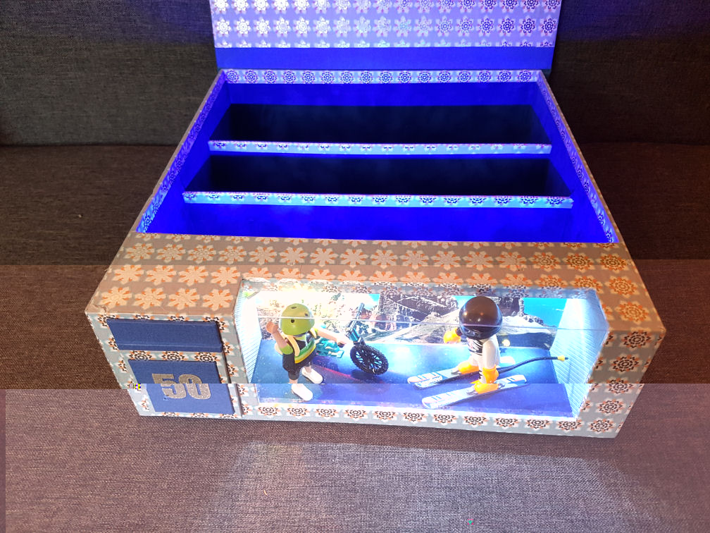 Konkret geht es um eine Geschenkschachtel, wo beim Öffnen im vorderen Schaufenster die Beleuchtung angeht und zusätzlich ein Musik-Modul zum Spielen beginnt.