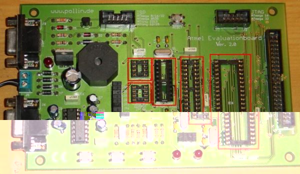 Die rot markierten Vierecke, sind die IC-Sockets für die verschiedenen Microcontrollern.