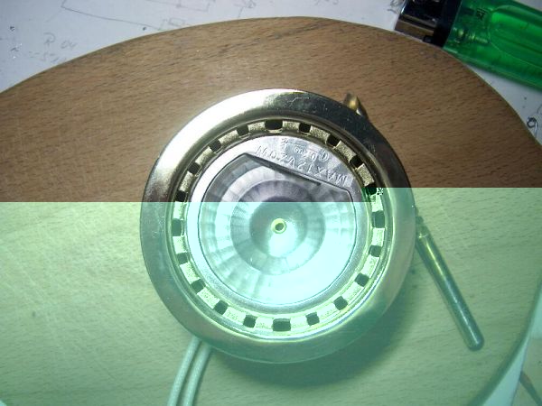 Das Deckglas wurde entfernt. Der Reflektor ist mit dem Metallgehäuse vernietet