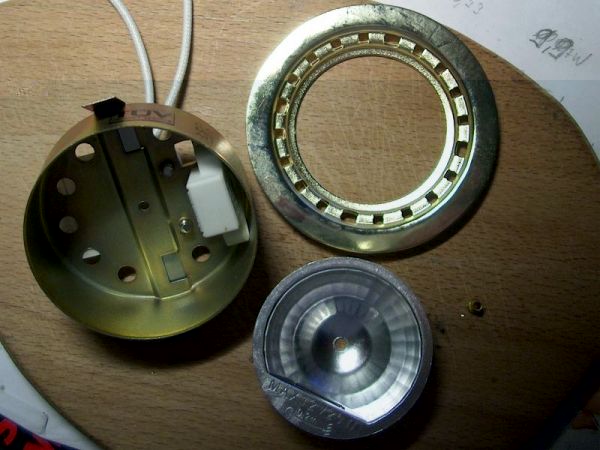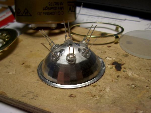 Nach dem Bohren die LED´s eingesetzt. Sicht in den Reflektor mit Einzelteilen der Leuchte