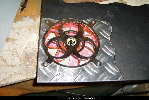 An der Rechten seite wurde ein 120ér Loch geschnitten und eine Passende Blende aus 2mm Riffelblech.