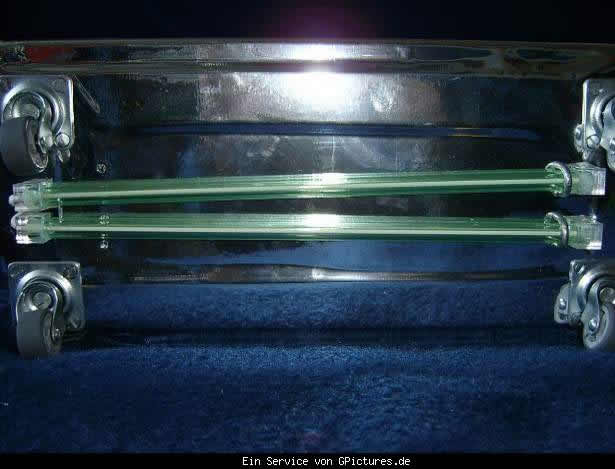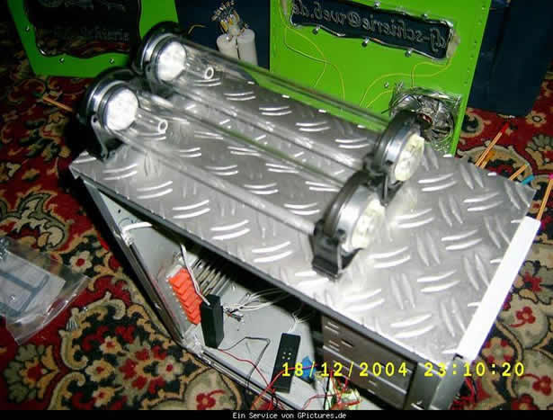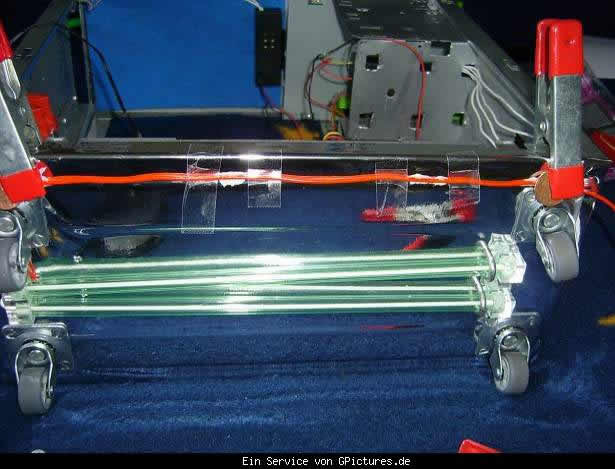 ---------- Der Unterboden wurde mit 4 Gummirollen versehen und mit Chromefolie beklebt,eine Grüne und Rote Unterbodenbeleuchtung mußte natürlich auch her.