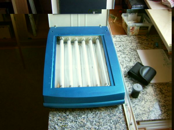 ca 2 Euro vom Flohmarkt einen Gesichtsbräuner 5 Euro auch vom Fl.-Markt. Beide ausschlachten und den Bräuner in den Scanner eingebaut. Fertig ist der Platinenbelichter. Ich selbst habe schon 8 Stück nach diesem Prinzip gebaut und weiterverkauft.(für 50 Euro) Belichtungszeit liegt bei etwa 90 sek.