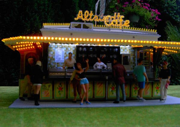 Gestern habe ich mein Altstadtkaffee fertig bekommen. Hier mal ein Bild davon. Am Modell brennen 468 LEDs. Die Innenbeleuchtung ist mit Ultraweissen LEDs von Lumitronix bestückt. Der Kraftstrom ist 2x6 Volt-2x4 Ampere.