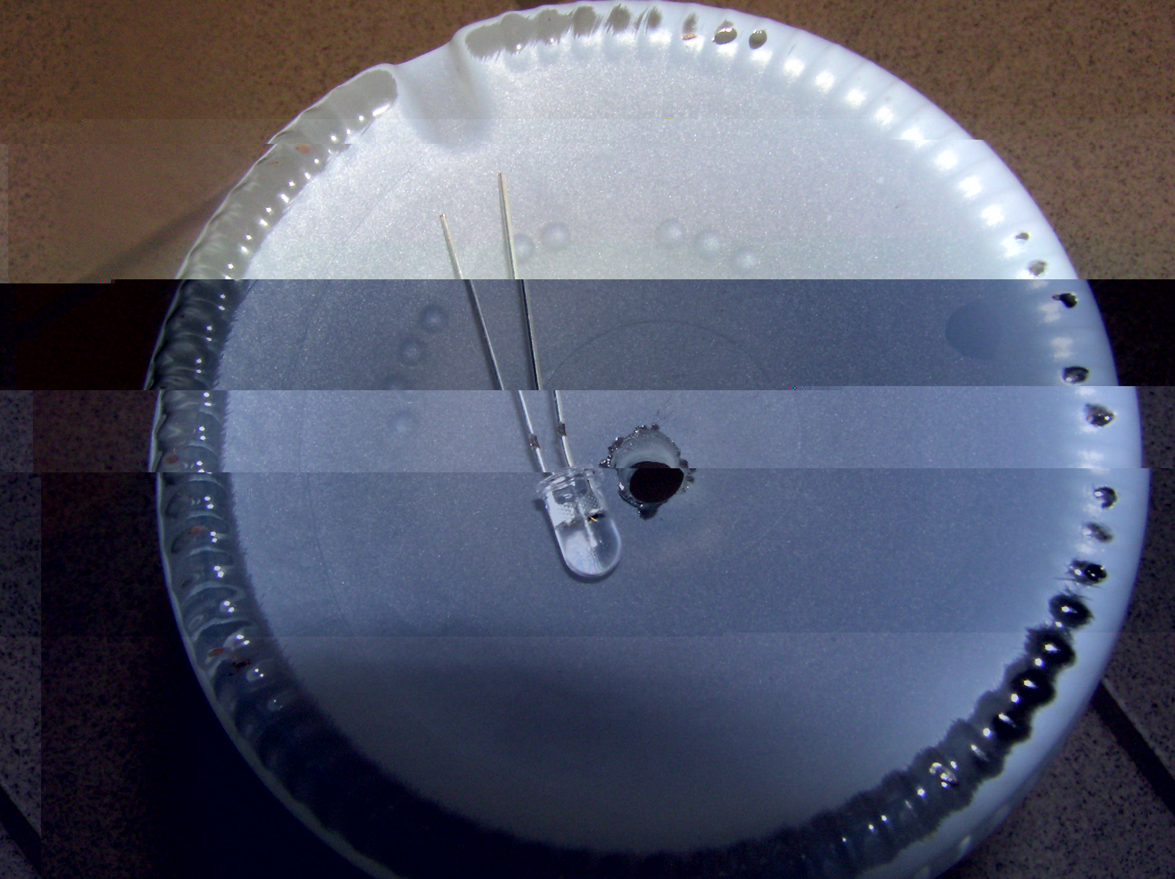 Die LED ebend flach feilen, damit der Austrittsvonkel größer wird, in das gebohrte Loch stecken, verkabeln, fertig. Insgesamt ein Mod der in einer Stunde gemacht ist, und Trotzdem Super in jedem Partykeller wirkt!