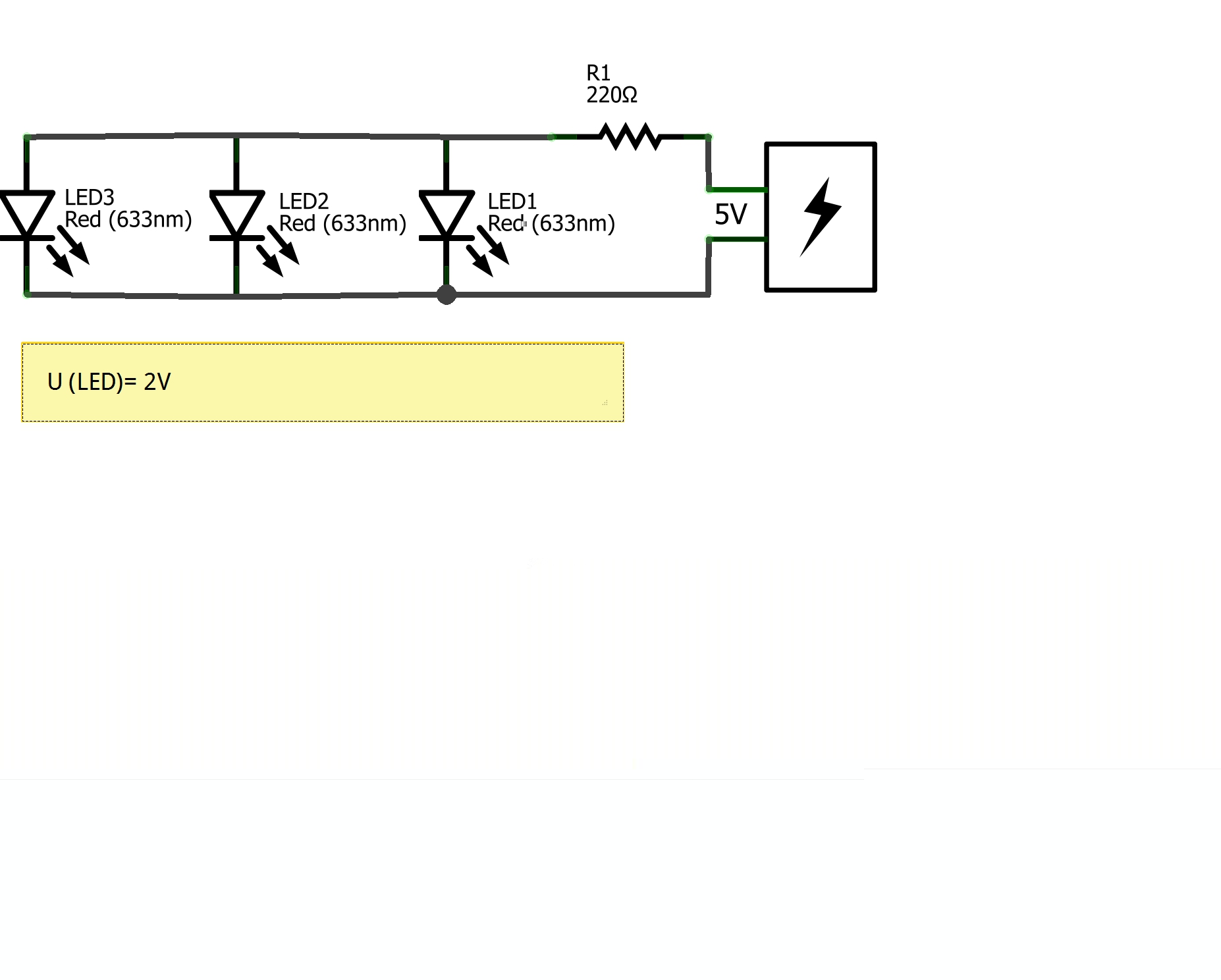 Da die LEDs parallel geschaltet sind, ist die Spannung da überall gleich (benötigte Spannung 2V...daraus resultiert das der Widerstand 3V fressen muß?).