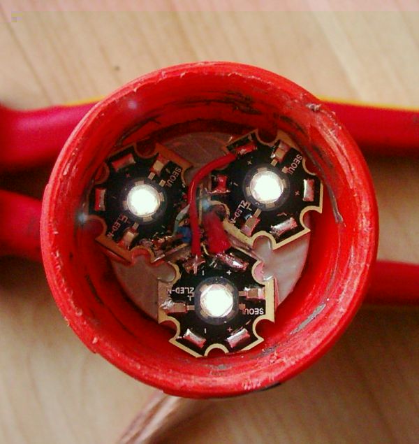 Nach meinen Umbau von 3 Luxeon K2 auf 3 Soul P4 hatte ich meine Lampe mal wieder offen und kann somit Bilder vom Innenleben der Gardena Lichtdusche präsentieren: