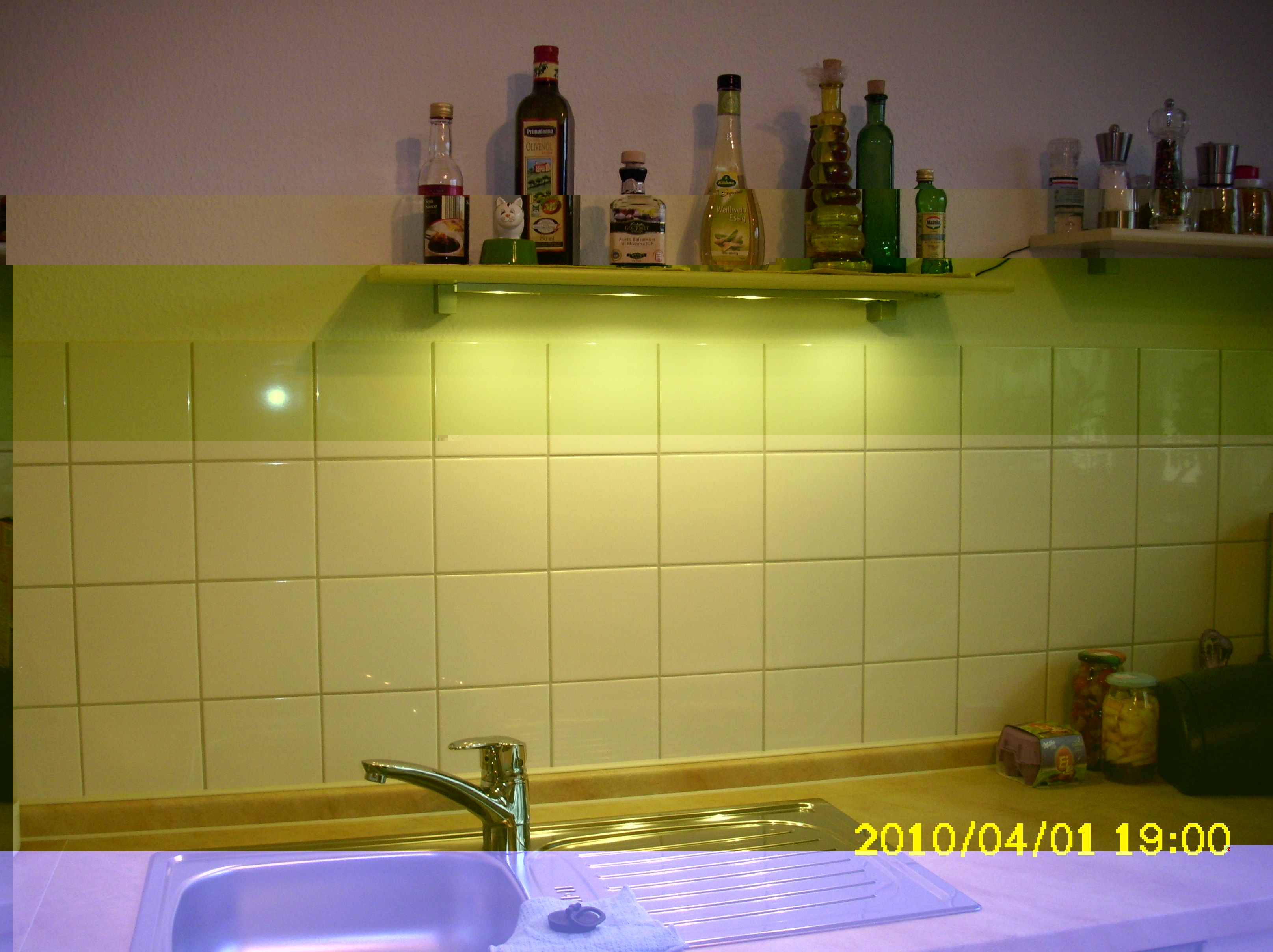 - Vergleich 25W-Kerzen-Glühlampe vs. 5,6-Watt (ab Steckdose) LED-Leiste (4x Cree XR-E @ 350 mA, 4,5W gehen in die LEDs + KSQ, 380-390 mW davon in die KSQ, wobei davon wiederum allein 300 mW in den Basis-Vorwiderstand des PNP-Transistors gehen...)