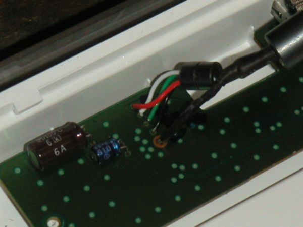 So dann will ich mal beginnen. Zuerst hat man die Tastatur vor sich liegen. Schaut dann so aus: Dann nimmt man die Tastatur dreht Sie auf den Rücken und entfernt die 3 Inbusschrauben. Ich habe mit metrischen und zöllischen Schlüsseln probiert, wollte aber nix so richtig passen. Nunja mit dem 1,5mm gings auf jedenfall einigermaßen: Wenn man soweit ist kann man die Tastatur wieder umdrehen und die Tastenn allesammt abheben. dabei muss man auf das Flachbankabel aufpassen welches in die Platine gesteckt ist. Das kann man aber mit einem leichten zug herausziehen: Hier sieht man die Belegung der USB Leitung. Die dicke Leitung ist hierbei GND, also - und das rote + 5V: Jetzt kann man Anfangen alle noch übrigen Schrauben mit dem Kreuzzschlitzschraubendreher zu entfernen und zerlegt die Tastatur vorsichtig: Dann werden die Bohrlöcher zuerst angezeichnet, je nachdem wie viele ihr nehmen wollt und wie ihr die setzt. Das Plastikteil wird dabei auch umgedreht und so mit dem 5mm Bohrer gebohrt um später die LEDs einsetzen zu können: Dann setzte man die LEDs ein an denen man zuvor die Füßchen bis auf etwa 3mm abgezwackt hat von innen in die Bohrungen ein. - (Kathode) der LEDs zeigt hierbei in Richtung Unterboden: Wenn dann alle LEDs eingesetzt wurden, werden diese mit etwas Sekundenkleber fixiert. So schaut das dann aus: Dann fängt man an alle Kathoden (-) der LEDs mit dem Kupfer oder Silberdraht zu verlöten: Wenn man nun soweit ist wird an jeden + Pol (Anode) der LED ein passender Widerstand, hier 57 Ohm gelötet. dann wird der + Pol an einer Stelle zusammengeführt. Es handelt sich hier also um eine reine Parallelschaltung: Dann wird die Doppellitze an der Platine abgegriffen und zu den LEDs geführt. Am besten mit dem Voltmeter zuvor nochmal die Spannung an der Platine prüfen um Fehler zu vermeiden: Nun sind wir fast fertig. Jetzt müssen nur noch die Kabel sauber verlegt werden und dann kann man anfangen die Tastatur wieder zusammenzubauen. Dabei sollte man darauf achten das kein Dreck im Gehäuse ist, da man diesen sehr leicht sehen kann, weil das Geehäuse ja Transparent ist