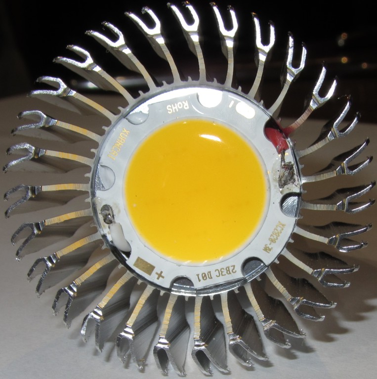 Was allerdings direkt auffällt: das "COB-Modul" scheint nur 6 LEDs zu enthalten. Ich hab mal versucht, dies mit dem Fotoapparat einzufangen: