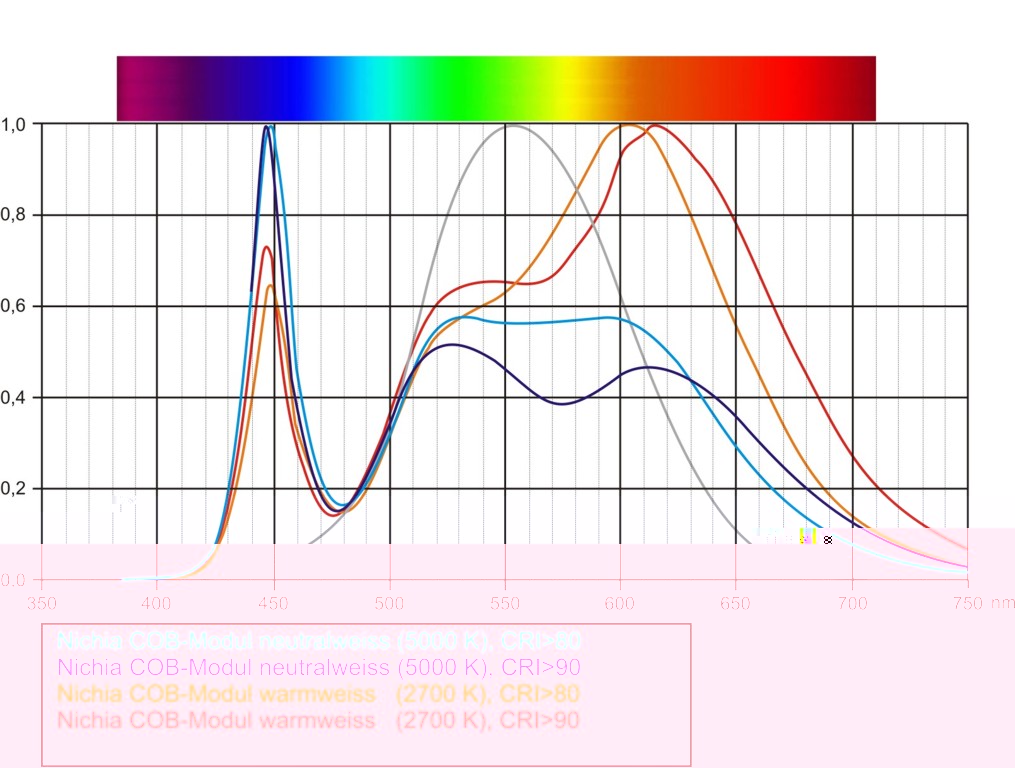 Ebenso sind beide Serien mit einem CRI von >80 Ra(typisch: 83 Ra) und >90 Ra (typisch: 93 Ra) erhältlich. Angeboten werden schlicht und einfach unterschiedliche Binnings. >80 Ra entspricht dabei dem Binning R8000, >90 Ra dem Binning R9000. Hier gilt: das Binning R9000 hat eine niedrigere Effizienz und damit bei gleicher Leistung einen (ca. 15%) geringeren Lichtstrom. Das bedeutet aber nicht, dass das R9000er-Binning einen schlechteren Wirkungsgrad hat, also weniger elektrische Energie in Licht umwandelt. Vielmehr ist es so, dass der Spektralbereich der R9000er-Serie breiter gestreut ist und damit mehr Licht in Spektralbereichen aussendet, die vom menschlichen Auge mit deutlich verminderter Intensität wahrgenommen werden.