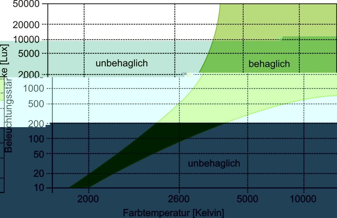 Eine Farbtemperatur von 2700 K sollte man nur dann wählen, wenn die dadurch erzeugte Beleuchtungsstärke bei unter 500 Lux bleibt. Umgekehrt sollte man eine Farbtemperatur von 5000 K nur dann wählen, wenn die erzielte Beleuchtungsstärke 300 Lux überschreitet. Warmweißes Licht mit höheren Beleuchtungsstärken bzw. neutralweißes Licht mit niedrigeren Beleuchtungsstärken können unnatürlich und dadurch unbehaglich wirken.