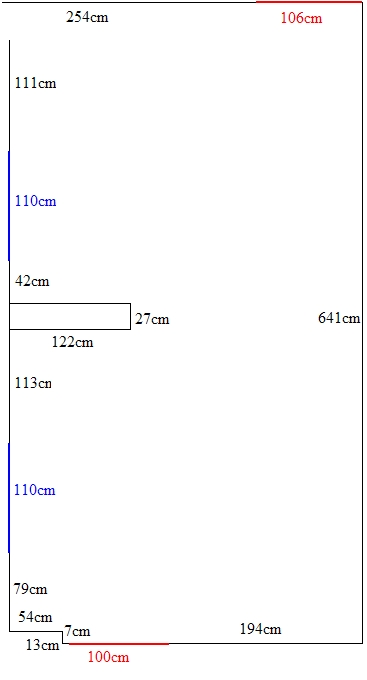 Hier nun erstmal eine kleine ungefäre skizze meines zimmers, Das blaue sind die Fenster und das Rote sind die Türen, mein zimmer ist nicht rechtwinklig, deswegen fehlt Links oben auch was, aber das soll nur als grobe Orientierung Helfen