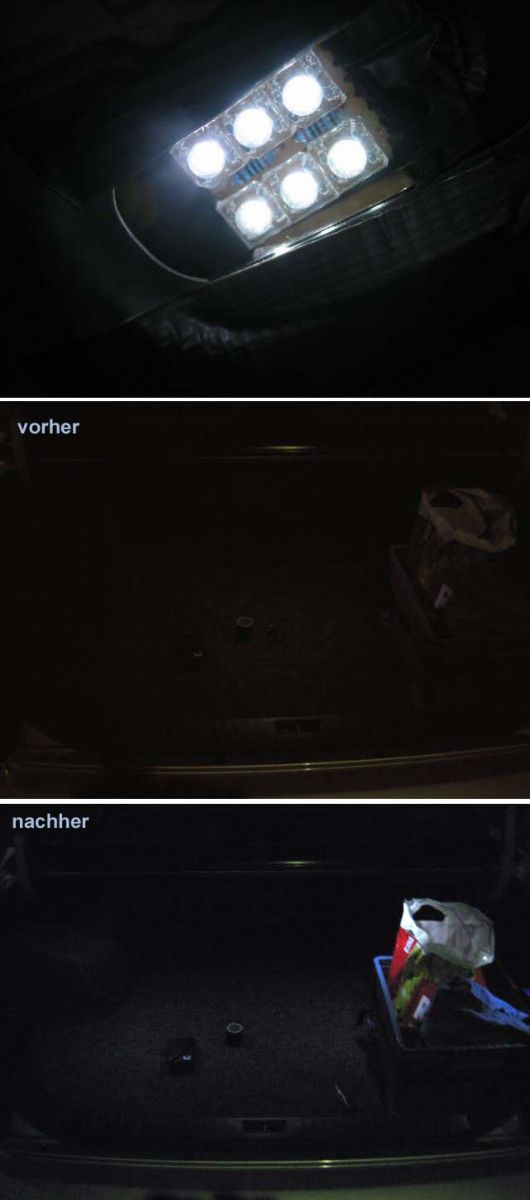 Nehmt weiße Suflus (70mA Einchip, die Novas gibts ja leider nicht mehr), und macht noch wenigstens eine zusätzliche Lichtquelle, entfernt von der originalen, und der Kofferraum wird deutlich besser ausgeleuchtet. Dazu kommt eben noch, daß es jetzt für die Batterie kein Problem ist, die Klappe mal länger offen zu lassen.