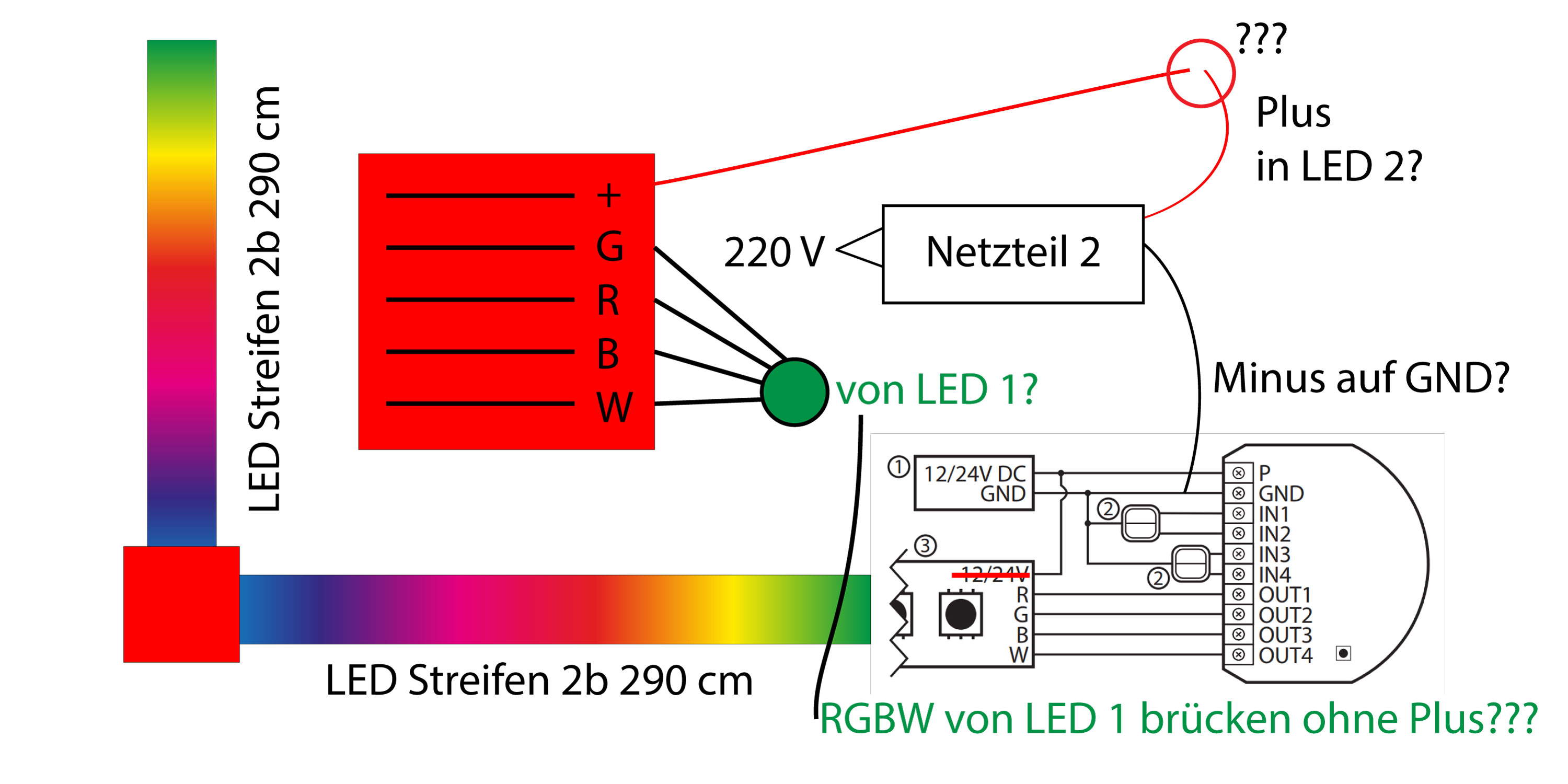 Kann mir jemand sagen, wie ich das mit der Stromzufuhr löse und ob die Verbindung von LED1 + LED2 beim Controller auch so ankommt und ob das Minus von Netzteil mit auf das Minus des ersten Netzteils angelegt werden kann?