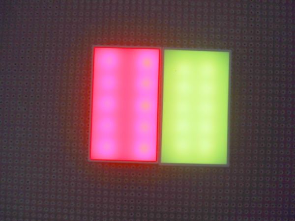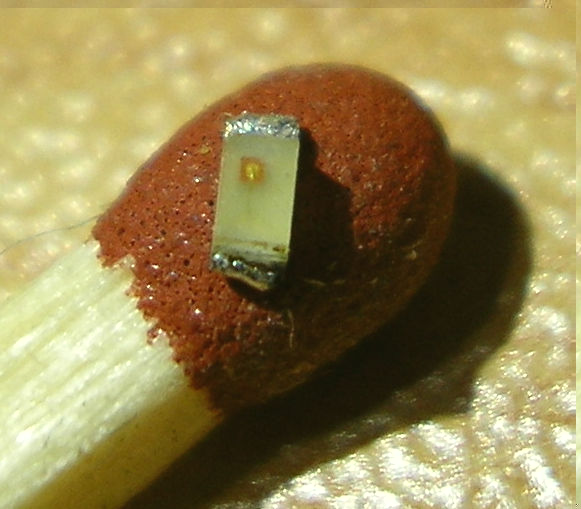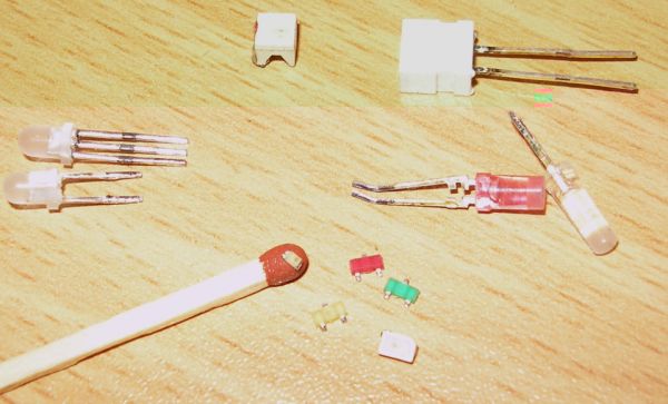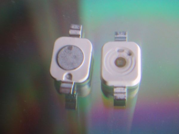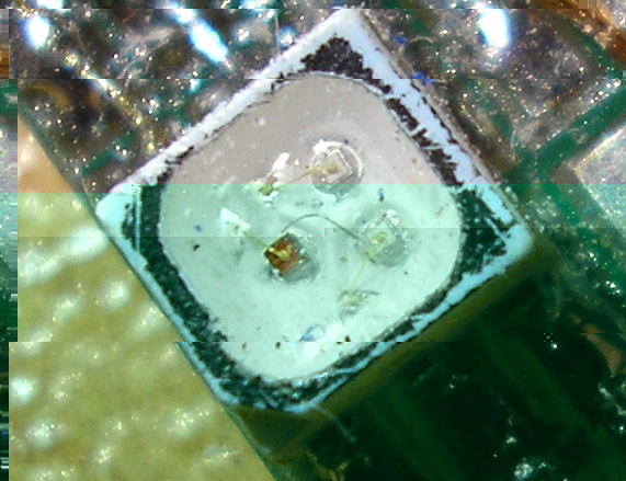 Darunter: Die PLLC LED. Eine Mehrchip-SMD-LED, bei der alle 4 Chips einzelne Kathode und Anode haben! Das hat den entscheidenden Vorteil, daß man sie in Reihe schalten kann.