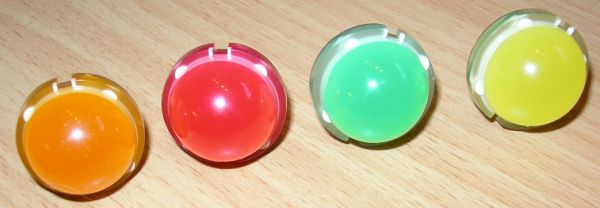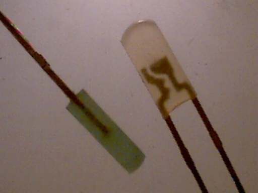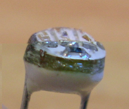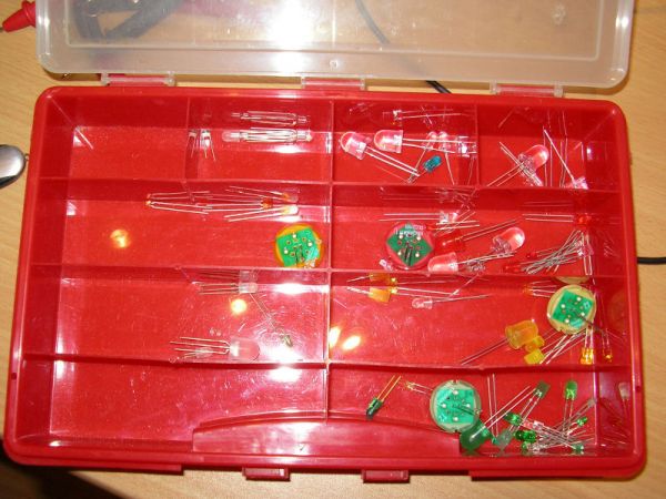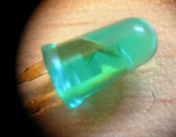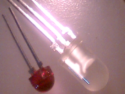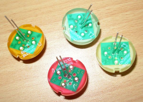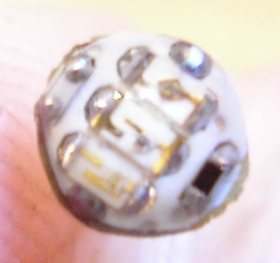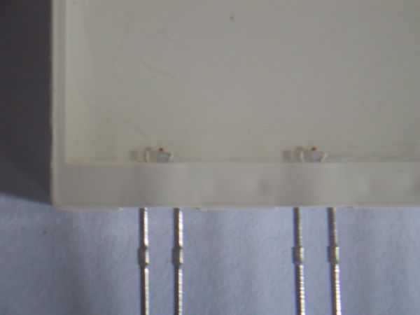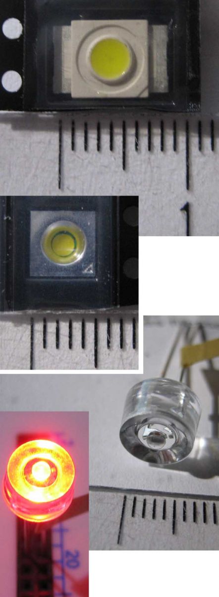Unten die ebenfalls geniale, nicht mehr produzierte DR-LED. (Hersteller: Omron). Auch Double-Reflective-LED genannt. Durch einen speziellen Reflektor wurde alles Licht, was bei normalen 5mm LEDS seitlich zwischen Chip und Dom abgestrahlt wird, nach vorn gelenkt. Dadurch leuchten sie mit herkömmlichem 20mA-Chip nahezu genauso hell wie 70mA-Superflux-LEDs!