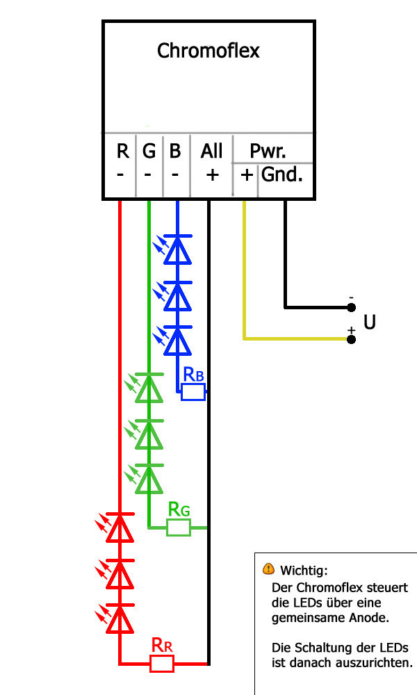 Beachte: Einige RGB-LEDs (also LEDs mit 3 Chips im Gehäuse und 4 Anschlüssen) können sowohl über eine gemeinsame Anode oder aber über eine gemeinsam Kathode (Minuspol) verfügen! Letztere sind in Verbindung mit dem Chromoflex leider nicht zu gebrauchen.