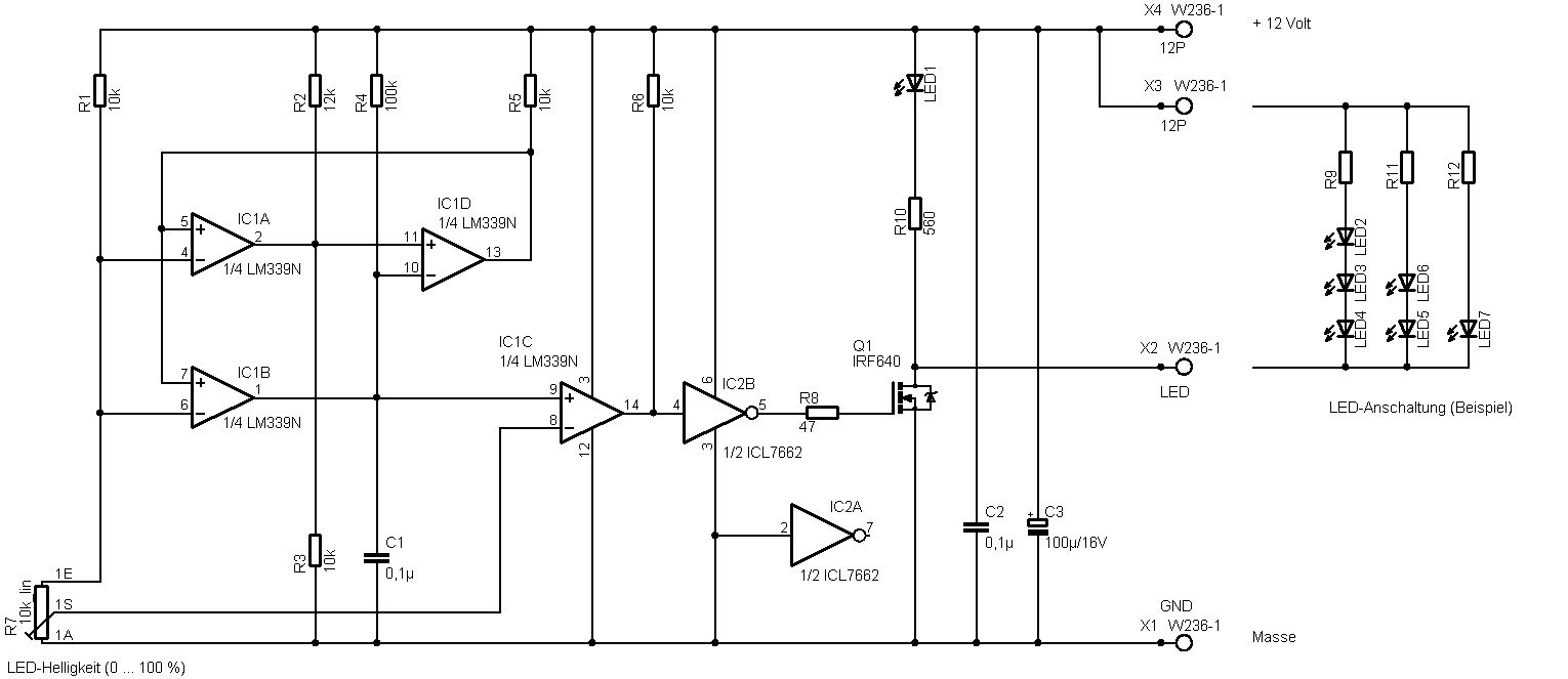 Wem der Treiber-IC zu teuer ist - einfach weglassen, R6 etwas niederohmiger dimensionieren, am Komparator die Pins 8 und 9 tauschen und die Schaltung sollte genau so gut funktionieren.