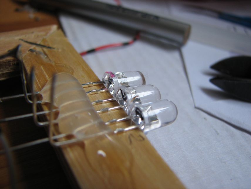 Die weißen LED's sind in Stahlgehäusen montiert. Die blauen 3mm LED's direkt im Holz versenkt (leicht rechts oben im Bild zu sehen).