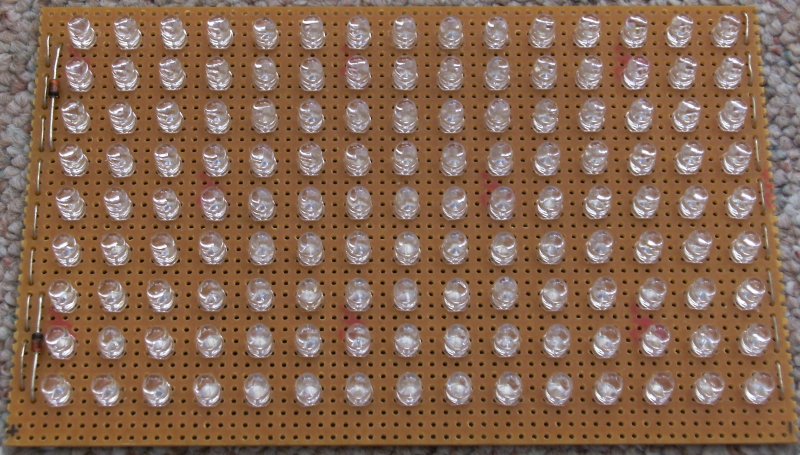 Bei einer Plattengröße von 20 x 30cm und einem Led-Abstand von nur 2cm würde man 150 Led montieren können. Dazu wären 450 Widerstände nötig, sodass insgesamt 600 Bauteile montiert werden müssen.Jede Led hat 4 Beinchen = 600 Lötstellen, jeder Widerstand hat 2 Anschlüsse = 900 Lötstellen, sind zusammen 1500 Lötpunkte.