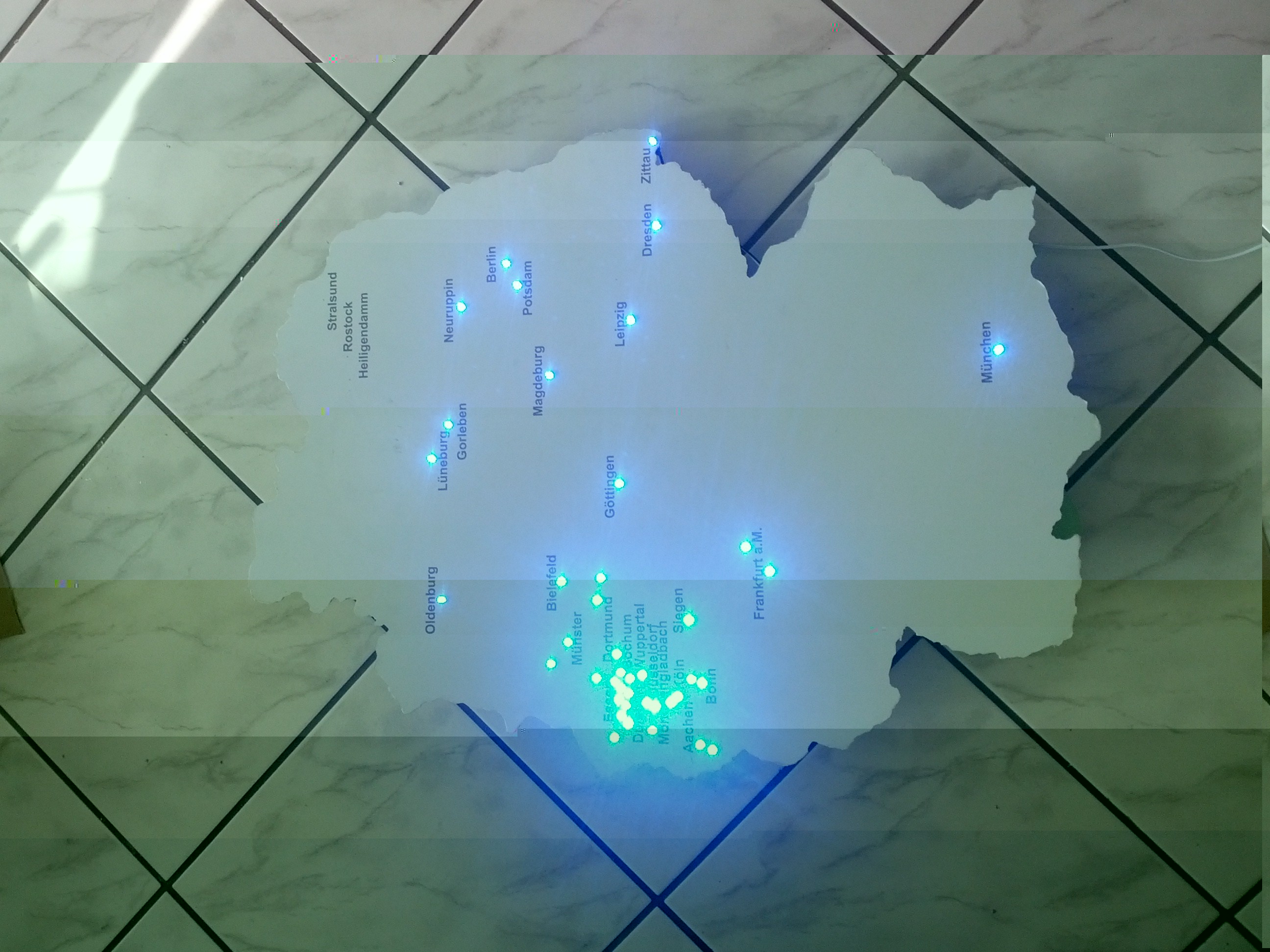 Es soll eine ca. 150cm hohe Deutschlandkarte werden, auf der mit Hilfe von LEDs (20-30 oder 40-50) diverse Einsatzorte/Städte markiert werden.