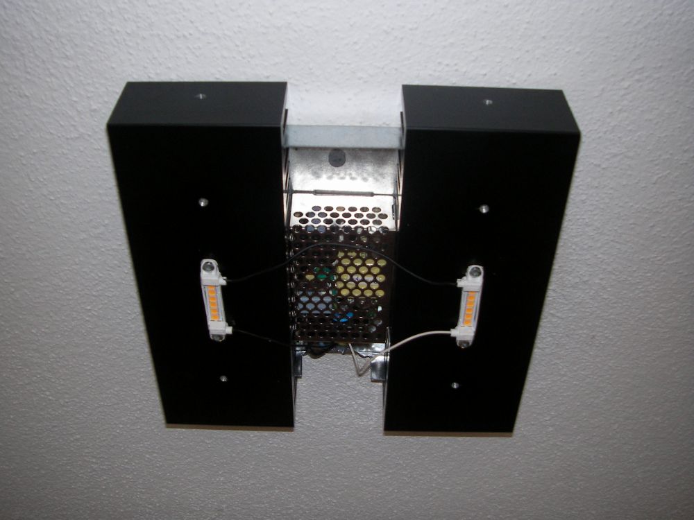 Das Ganze wird mit einem gekanteten Stahlblech zusammengehalten. Die Biegung des Stahlblechs ist parralel zu den Rippen des Kühlkörpers, dass sich die Lampe nicht durchbiegt, obwohl sie in der Mitte (neben dem Netzteil) aufgehängt ist.
