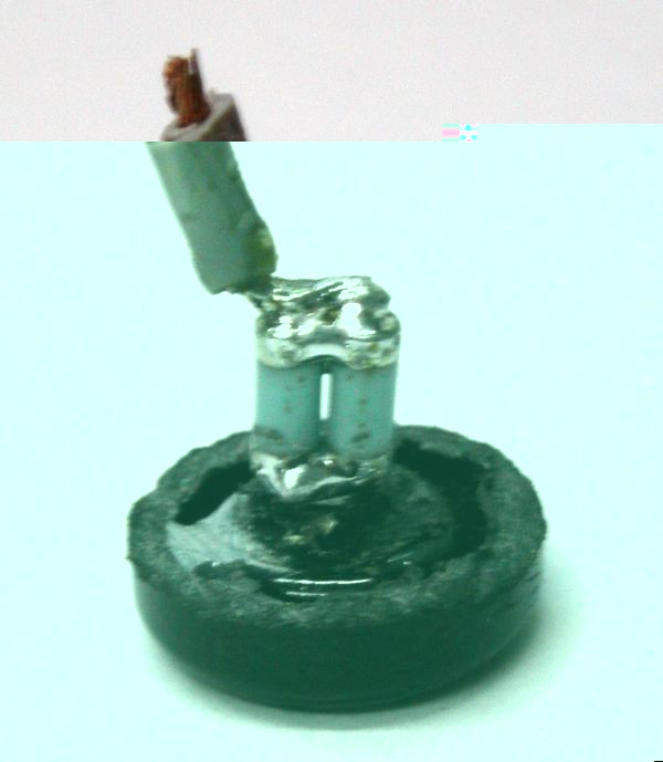 Für alle die bereits einen neuen (weißen) Sockel am Leuchtmittel der UK44 haben: Entfernt den Stift, bringt die SMD-Widerstände direkt am Stift an und vergiest den Stift im Cu-Rohr mit Epoxydharz. Aber etwas muss er herausschauen um zur Batterie Kontakt herzustellen.