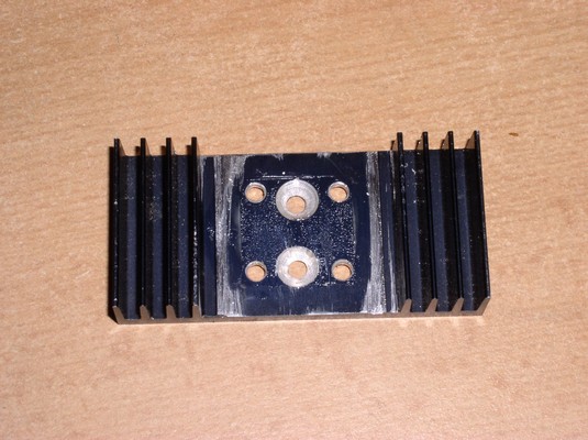 Danach habe ich einen Kühlkörper der so rum lag ein bischen modifiziert. 2 Kühlrippen mussten wegen des Abstrahlverhaltens dran glauben. Zusätzlich habe ich dann noch 4 Löcher für die P5 gebohrt und natürlich noch 2 für die Befestigung in der Lampe. Diese schön angesenkt, damit sowohl die P5 schön plan auf dem Kühlkörper aufliegt, als auch der Kühlkörper im Gehäuse.