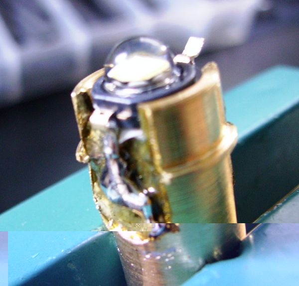 Die 5W-Led wurde von der Original-Platine entfernt, mit Wärmeleitkleber auf den Messingblock geklebt und den Minuspol seitlich am Messingblock verlötet. Den Pluspol habe ich an der Seite durch die Bohrung nach unten durchgeführt, durch den Isolator gesteckt und mit einem größeren Lötpunkt als Batterieanschluß versehen.
