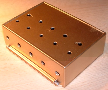 Mit Goldlack´n bißchen hübsch gemacht und mit je 5 5mm 6mm 8mm Löchern versehen. Der Kunststoff ist sehr hart und splitterte an drei Bohrlöchern ab. Das wird aber von den Überwurfmuttern der Schalter verdeckt.
