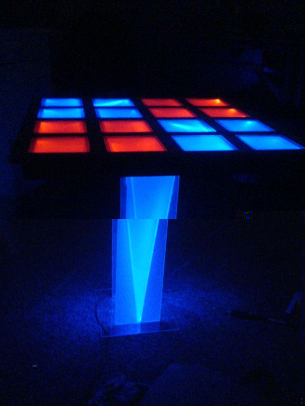 Also. Der Tisch besteht aus einer Holzplatte, wodrauf ein Holzgitter gesetzt ist. sprich die platte ist in 4 flächen unterteilt. Dadrauf sind dann Leisten montiert und dadrüber etwas kleinere. dazwischen sitzen dann die plexiplatten. Die leds sitzen natürlich an den rändern des entstehenden hohlraums.