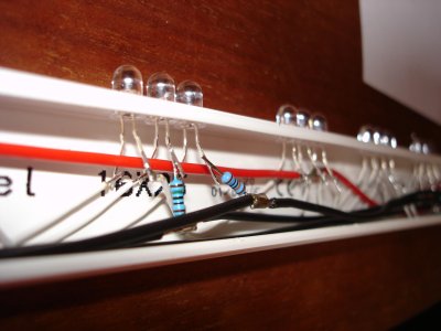 Die roten LEDs schalte ich in 5er Grüppchen in Reihe mit einem 47 Ohm Widerstand, die grünen und blauen LEDs in 3er Grüppchen mit einem 150 bzw. 130 Ohm Widerstand.